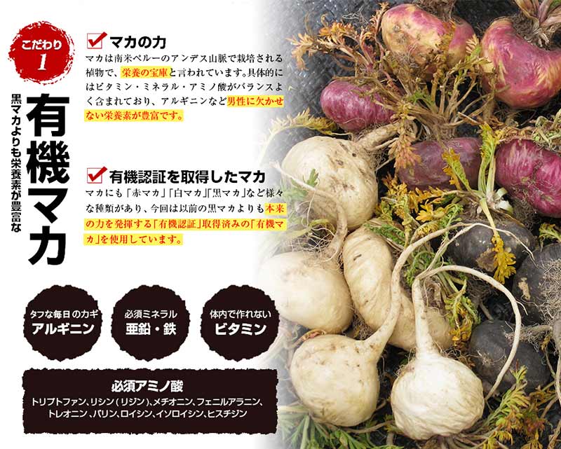 こだわりの有機マカを大量に配合しているので、アルギニンを効率よく吸収することができるんです。